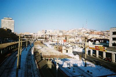 ロシアの民芸品を売っている土産物屋を覘いたが、高そうなので何も買わずに出た。次にウラジオストク駅に向かった。ここは、あのシベリア鉄道の発着する駅。テレビやガイドブックでは何度も見たことがあるが、まさか自分がここに来るとは思わなかった。ヒッポと出会わなければロシアに来ようとは思わなかっただろうし、ましては真冬のウラジオストクなんて!ラリサも何度も私に聞いていた。「何故冬に来たの?見るものは何もないのに」って。