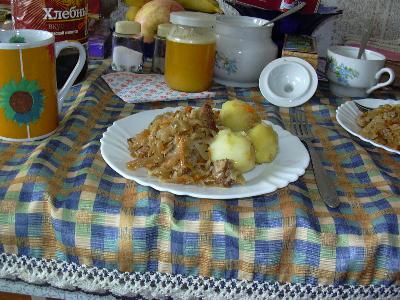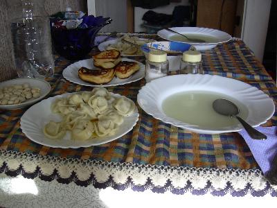 朝食(ブランチ?)はペルメニ。水ギョウザのようなもの。昔は各家庭で手作りしていたらしいが、とても時間がかかるため、今は冷凍のものをスーパーで買ってくるそうだ。たっぷりのお湯でゆでて、皿にバターを適宜置いてその上に熱々のペルメニを盛った。黒こしょうをふって食べた。ゆで汁もスープとしていただいた。肉の味がほんのりと出ていた。スープは塩味のお湯といった感じだけど、ペルメニはオーチンフクースナーでした。