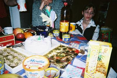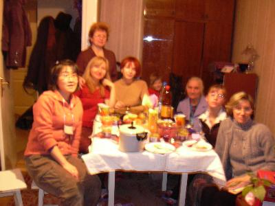 夕方5時頃から友達が集まってきた。ラリサもちょっときれいな洋服にいつの間にか着替えている。まず、3人家族(パパ、ママ、娘・推定13歳)、2人家族(ママ・スィエタと娘スーシャ・推定4歳)、ちょっと遅れてラリサの大学時代の同級生イリェーナ。髪が赤い。みんなにヒッポドゥルージアが作ってくれたパダールキーをあげた。スィエタはよく喋るおばちゃん。一人で喋っている。みんな楽しそうに聞いている。