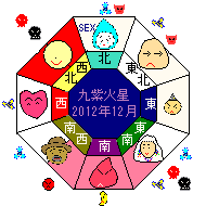 九紫火星は艮宮(東北)に入ります。やわらかな粘土と焼いた陶器の硬さをあわせ持つ質の宮です。九紫火星は先見性が強いタイプですが今年は先が良く見えなく迷います。今までの気持ちがぐらぐらと揺れ動き急に進路を変えたくなり一気に方向転換に走り出したりします。不安定で運気も低下しているので決めた道が正しいとは限りません。方向転換は助言が必要です。人間関係は好き嫌いが出るが良好です。家庭的で安らぎを求めるようになるでしょう。