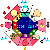 一白水星は 坤宮(こん) 南西の宮に入ります。坤は陽から陰へぶつかりながら変わる宮でその衝撃を吸収しやわらかく受け止める宮です。年運は急進の勢いの宮ですが優柔不断の決めきれない弱さがでて悩む月になります。坤の特徴の耐える力が発揮できる月で学芸術の基礎の取得や仕事での忍耐力は大いによし!人間関係もやわらかさがでて敵を作らない がまんする効果がで良好を得ます。家庭でもこの効果で安らぐでしょう。ただ、心の中では決めているはずなのに周りに流され歯がゆく心は揺れ動くでしょう。