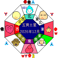 五黄土星は震宮(しん) 五行は木、時は春分(3月)ころ、方位は東の宮に入ります。 健康・子供運⑨運気最低(凶)SEX・秘密・苦悩・睡眠・研究。何事もうまく行かない。焦ってはいけない日。 |