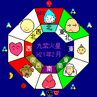 九紫火星己丑年(霹靂火へきれきか、一瞬の激しい雷火、変化が急激という暗示) 星(九紫火星)が中宮(中央)に入りました。帝王の宮ですから周りにぺこぺこされるのを好むようになります。隠れていたことや、別れの象意が強く出やすいので注意しましょう。中には運気が低迷する人もでそうです。謙虚さを忘れると後悔しますよ! 年盤は引越しに利用してください。今年は年の本命殺は |